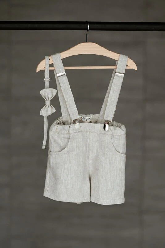 Linen shorts with fixed, non-removable suspenders, elastic waistband with button adjustment, side pockets, and a cut adapted for babies and toddlers.