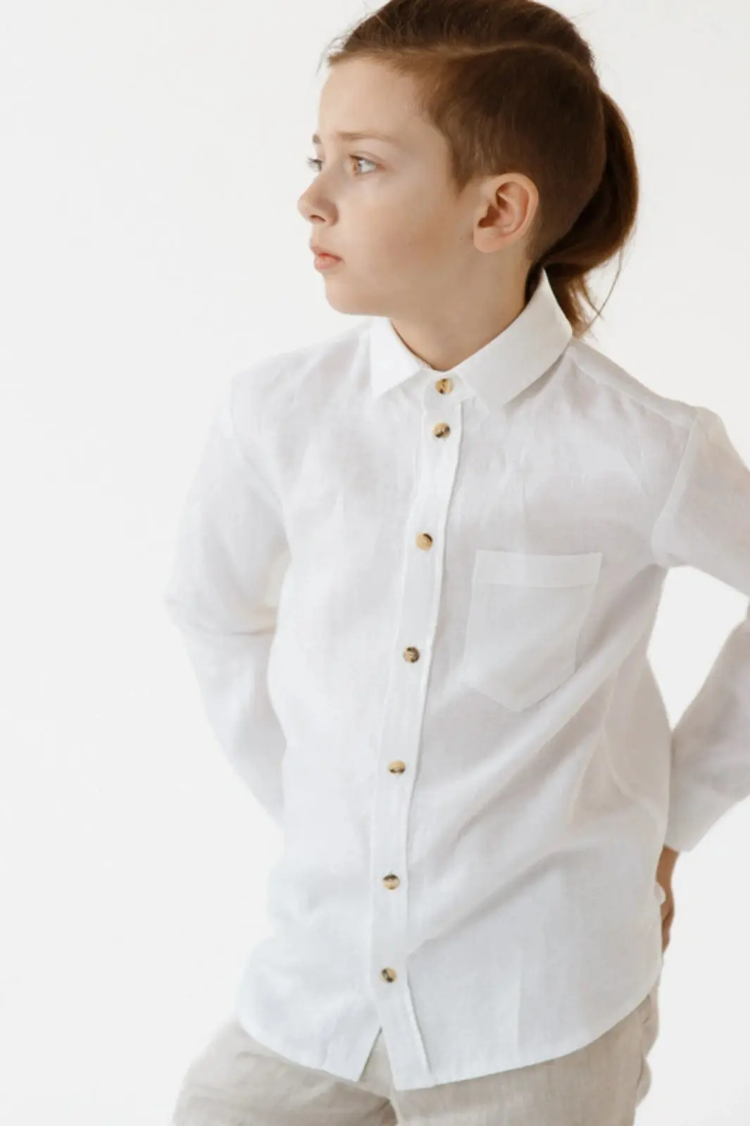 Boys’ long-sleeve linen shirt, handmade in Europe. Designed for weddings, baptisms, communions, and formal celebrations. Available for ages 8–15 years.