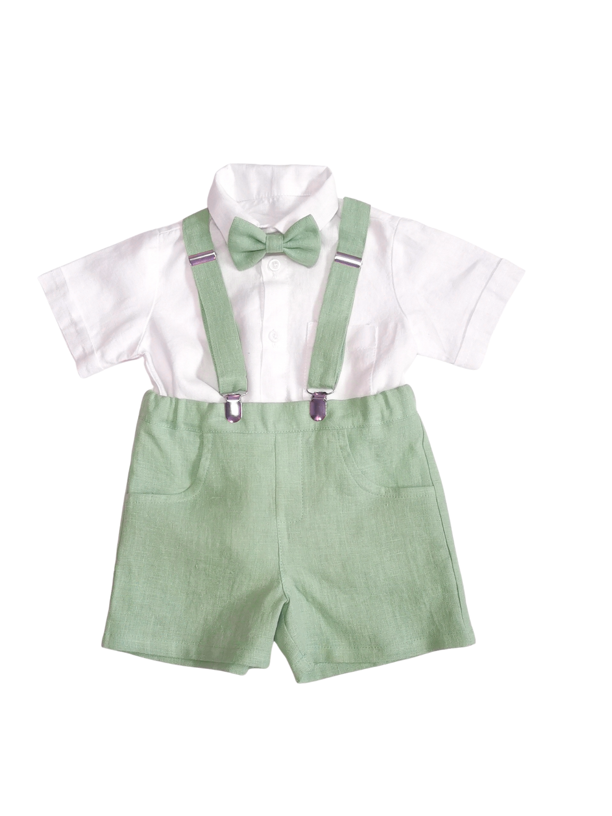 Boys linen suspender shorts set with bow tie and short-sleeve linen shirt. You can choose the color of the shirt from white or off white. You can choose the color of the pants from our entire linen fabric palette.