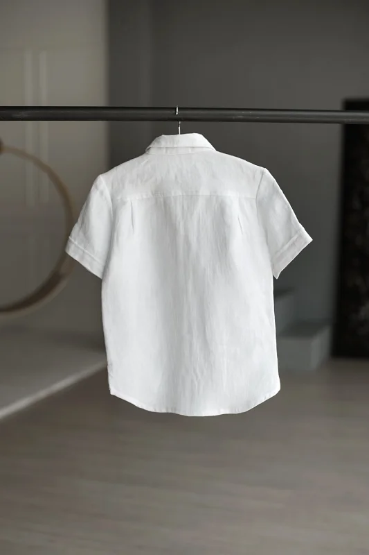 Short-sleeve boys’ linen shirt designed for warm-season wear and formal events. Available from 6 months to 15 years for coordinated outfits across multiple age groups.