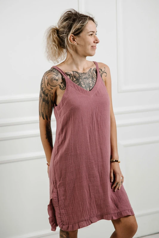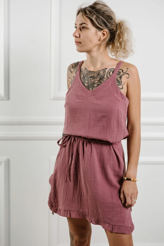 Lightweight muslin strap dress made from 100% double gauze cotton. Sleeveless, breathable, and naturally crinkled, with a relaxed fit and a removable waist tie.