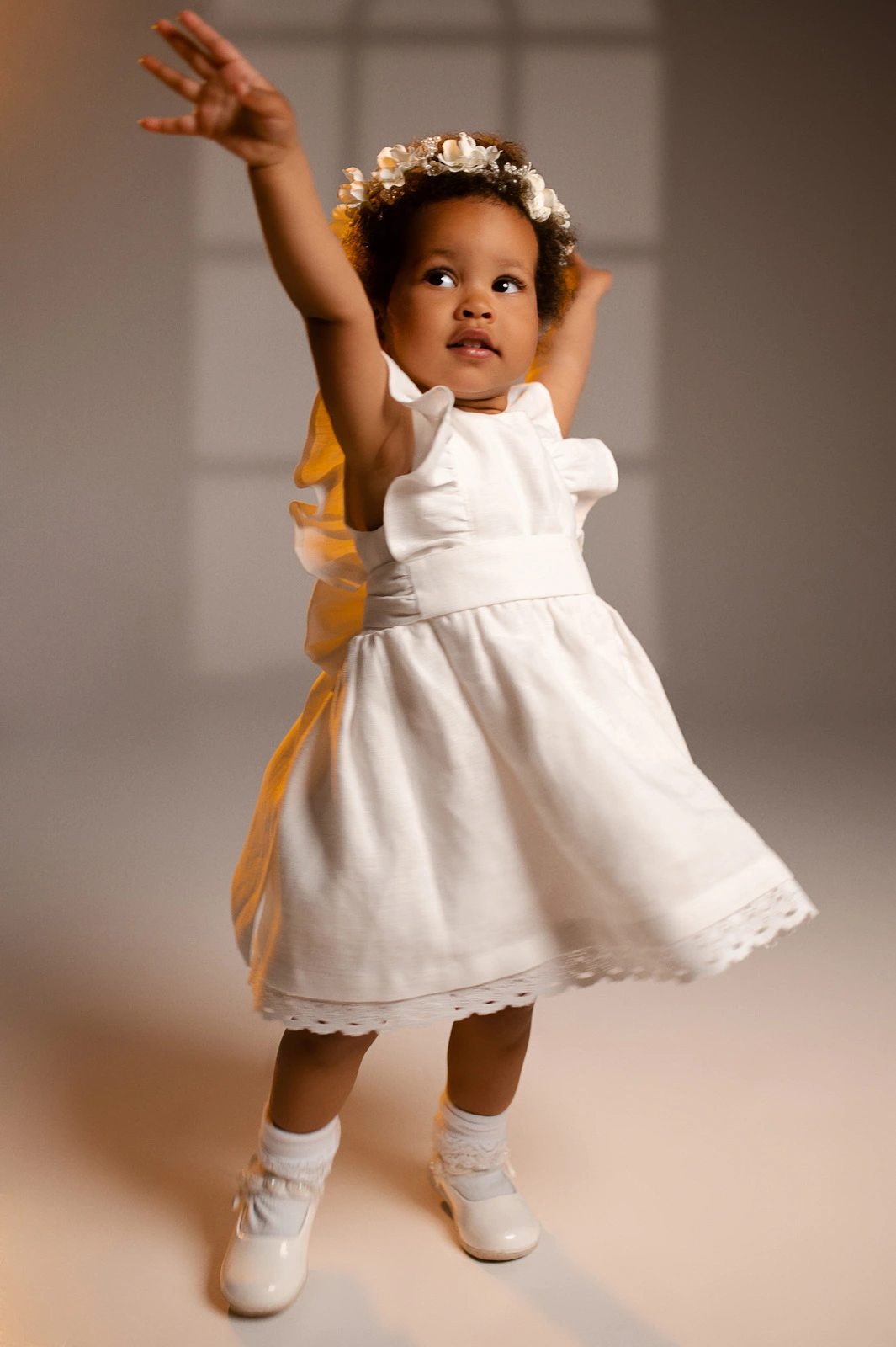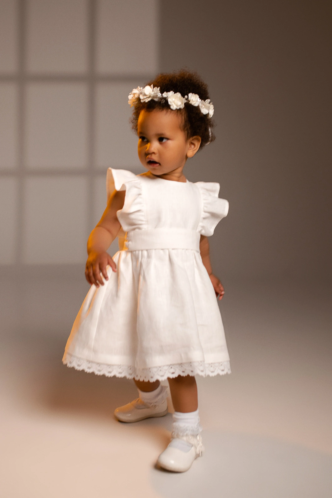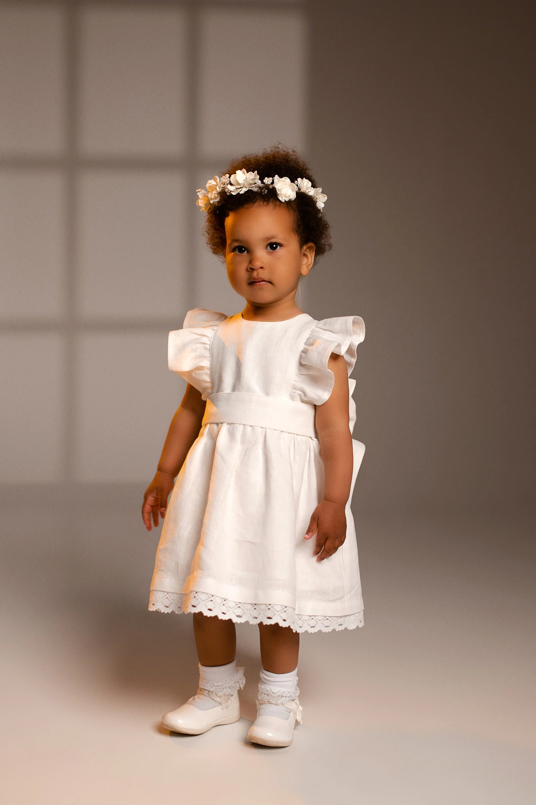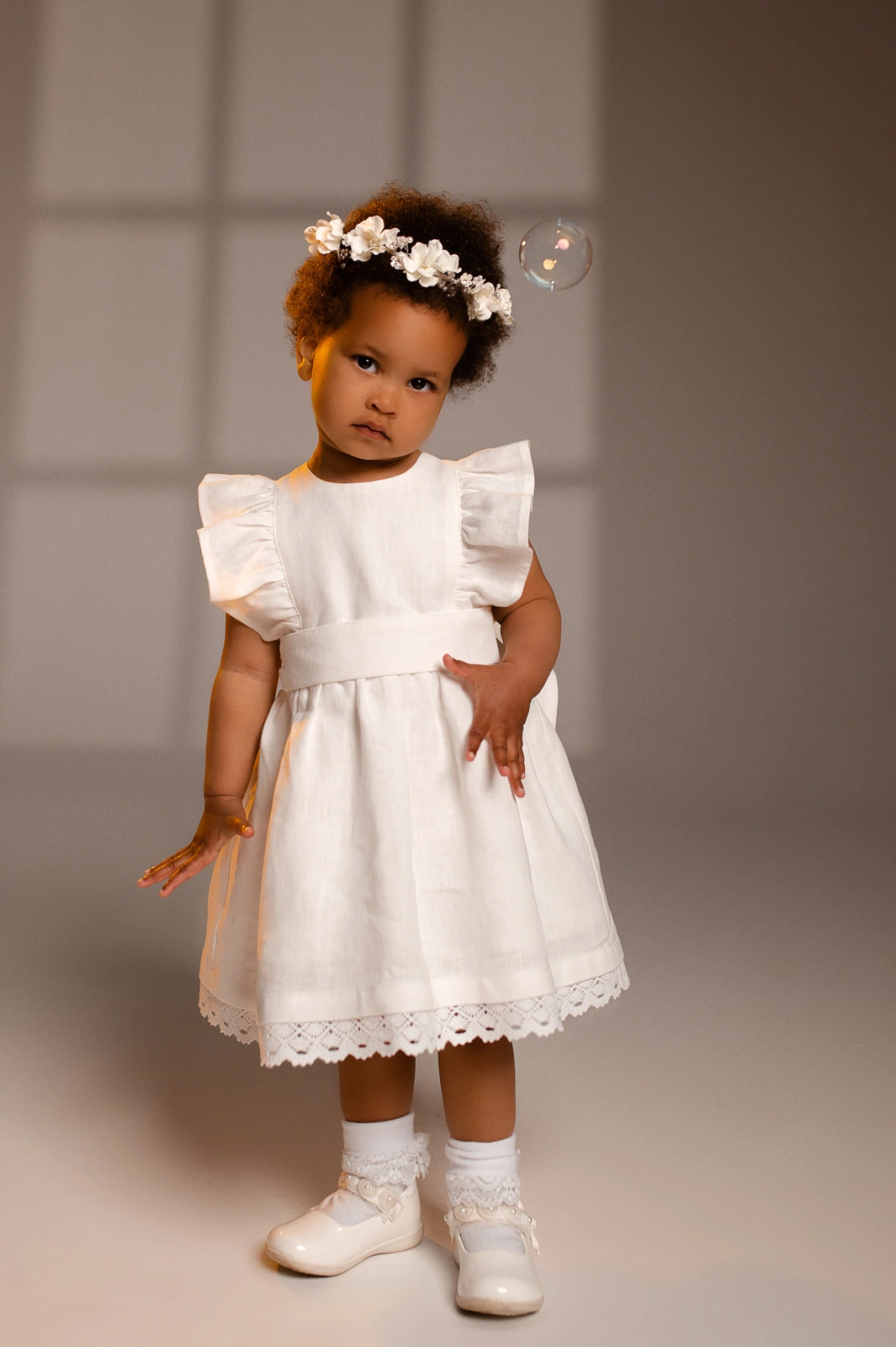 A handcrafted white linen dress with a lace hem and detachable linen sash, designed for baptisms, flower girls, and formal family celebrations. Suitable for girls aged 1–7 years.